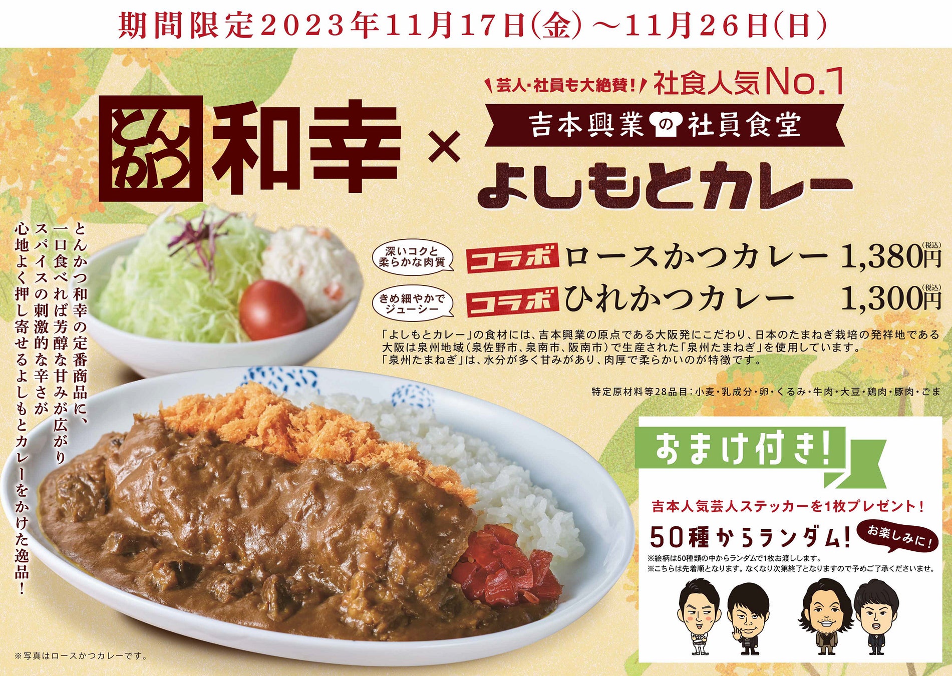 イオンのブラックフライデーセール期間に合わせ、イオンモールの「とんかつ和幸」40店舗でよしもとカレーを注文すると、おまけとして吉本人気芸人ステッカーがもらえる。全50種。キャンペーン期間は11月17日~26日。