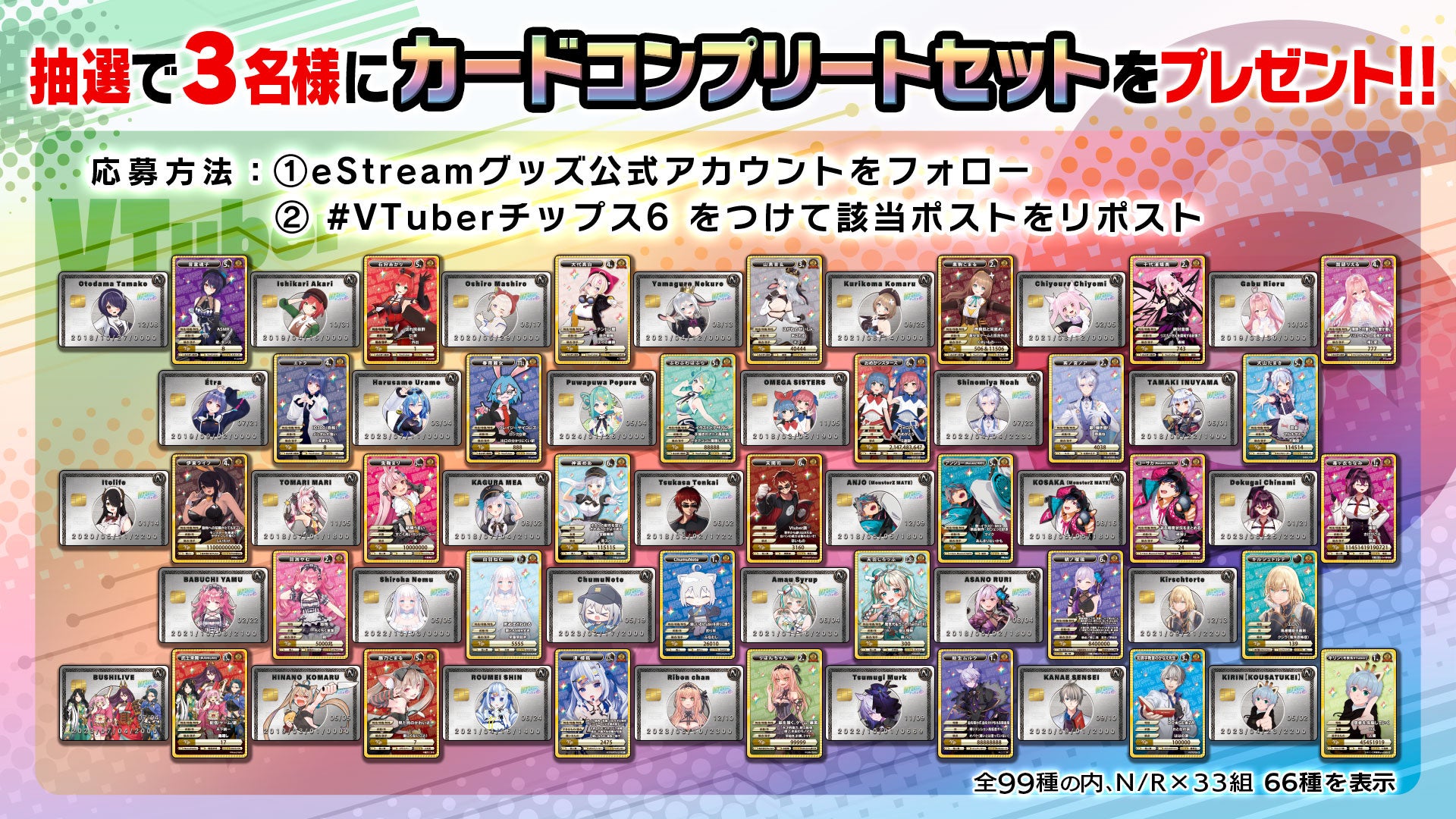人気VTuber全33組がカード化された本商品には、ネタ(N)カード33種、レア(R)カード33種、スーパーレア(SR)カード33種の全99種類のうち、ランダムでカードが1枚付いてきます。