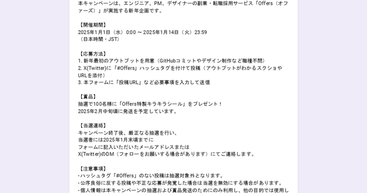 あけましておめでとうございます!本キャンペーンは、エンジニア、PM、デザイナーの副業・転職採用サービス「Offers(オファーズ)」が実施する新年企画です。【開催期間】2025年1月1日(水)0:00 ~ 2025年1月14日(火)23:5...