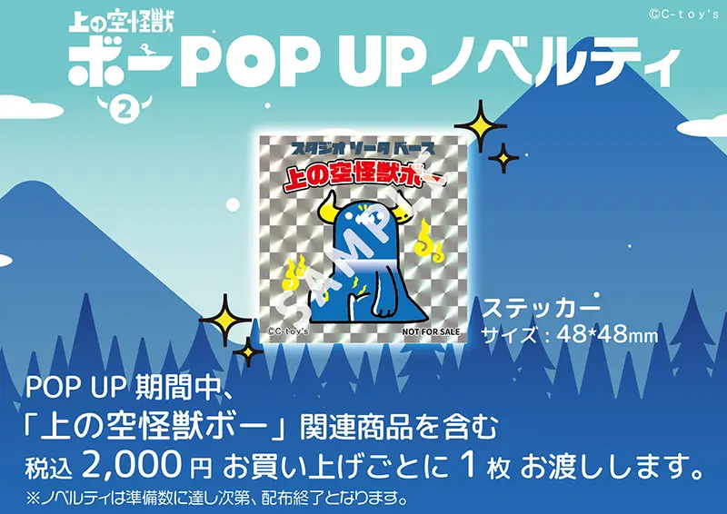 店舗にて『上の空怪獣ボー』関連商品を含む2,000円(税込)以上購入ごとに、限定ステッカーが1枚配布されます。※準備数に達し次第終了。