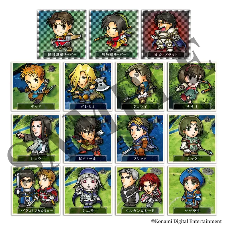 ※解放軍リーダー(『幻想水滸伝I』主人公)、新同盟軍リーダー(『幻想水滸伝II』主人公)、ルカの3種はキラシール仕様となります。