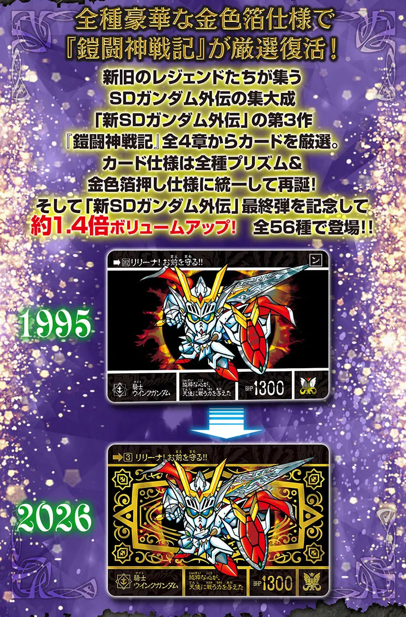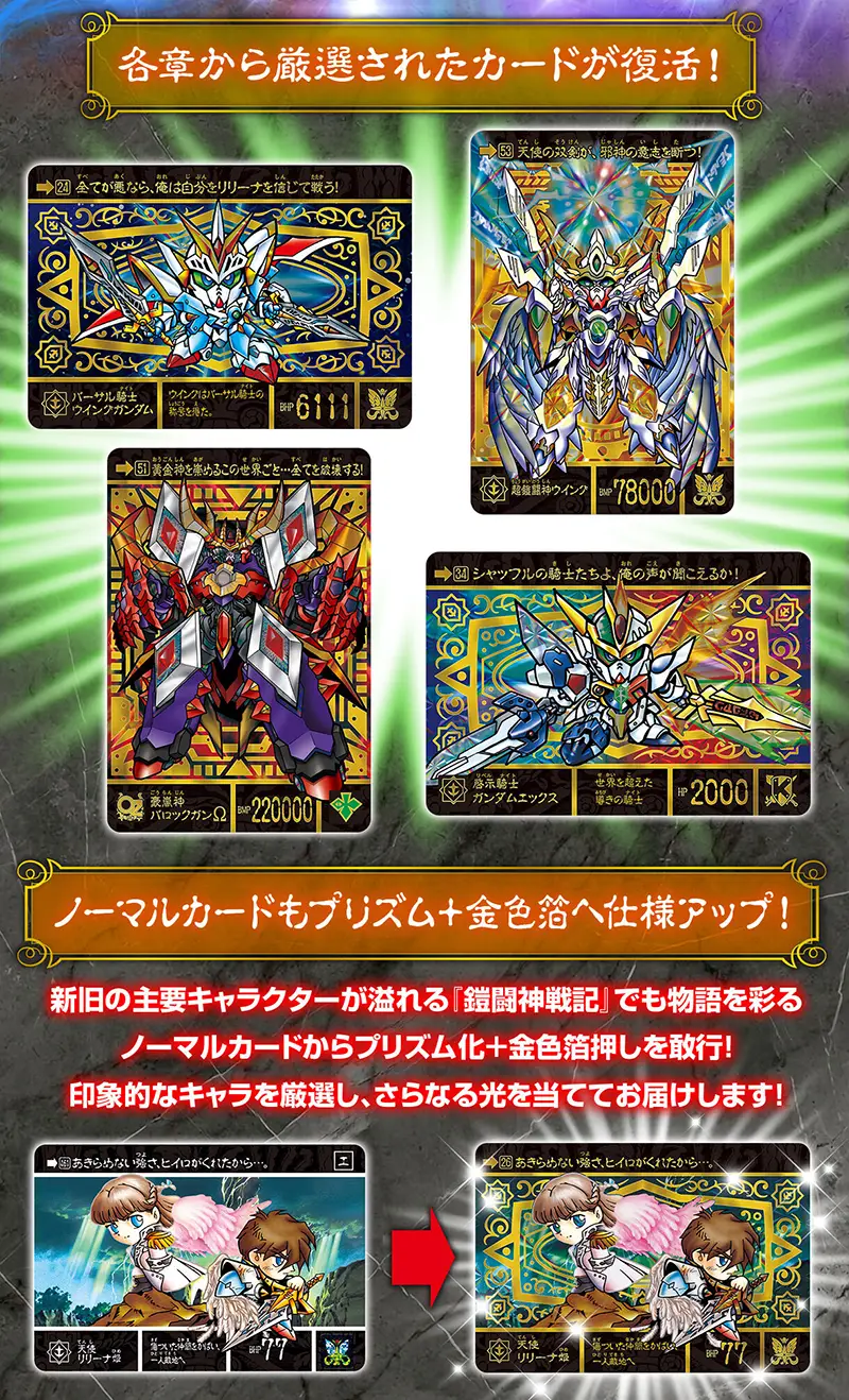 SDガンダム外伝の大人気シリーズ「鎧闘神戦記」より厳選されたカードが、全種プリズム箔押し仕様の「スペリオルドラゴンエディション」で復活!