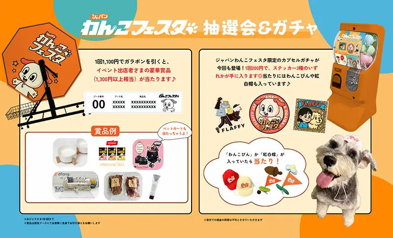会場には、ジャパンわんこフェスタ初企画となる「わんわん抽選会」と、前回好評だったイベント限定のカプセルガチャも登場します!「わんわん抽選会」は1回1,100円でガラポンを回すと、出店者さま提供の1,300円以上相当の豪華賞品が必ず当たるお得な企画。愛犬用おやつやケア用品など、嬉しいアイテムが盛りだくさん。また、会場限定カプセルガチャ(1回200円)では、3種類のオリジナルステッカーのほか、当たりには“わんこピン”や“紅白帽”などの特別アイテムが入っている場合も!