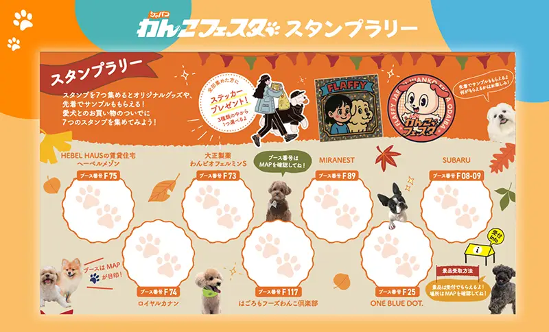 毎回大好評のスタンプラリーを今回も開催!パンフレット裏面が台紙になっており、会場内にある7つのブースを巡ってスタンプを集めると、景品として「FLAFFYオリジナルステッカー」3種類の中から1つをプレゼントします。さらに先着で愛犬のご飯もご用意。ブースを回りながらイベントをより楽しみ、思い出を形に残せる企画です。ぜひふるってご参加ください♪