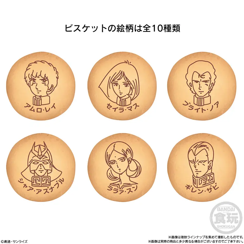 『機動戦士ガンダム』に登場したメイン人物キャラクターがプリントされたビスケット(バター味)と精密なミニキットがセットの商品です。