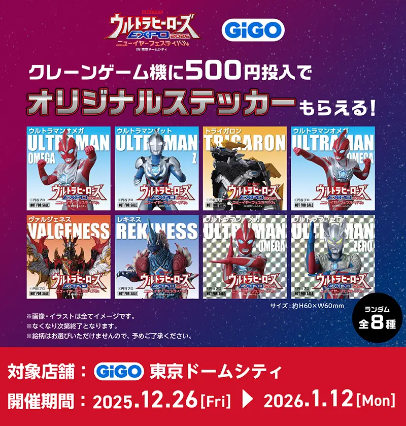 2025年12月26日(金)より「GiGO東京ドームシティ」にて開催される「ウルトラヒーローズEXPO 2026 ニューイヤーフェスティバル IN 東京ドームシティ」の開催を記念して、GiGO東京ドームシティ限定のキャンペーンが実施。