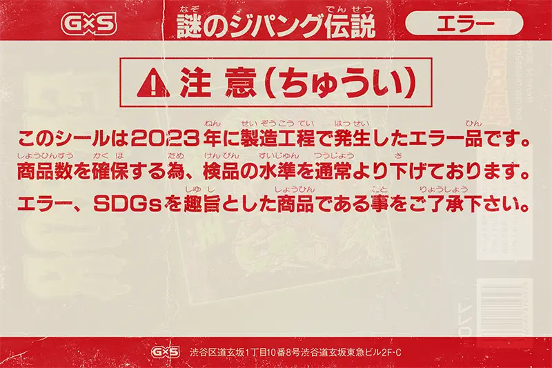 「謎のジパング伝説・流魔王〈エラーシール〉」が発売中。 ニュース X Bluesky Facebook LINE 2025.11.262025.11.27 ニュース その他ホビー エラーシールのアウトレットセール販売。 セール商品のお知らせ11月25日(火)20:00より流魔王エラーシールを販売いたします。 当時のエラー品につきご用意数に限りがありますのでご了承ください。詳細は商品ページよりご確認ください。https://t.co/7HEb0fJzma https://t.co/lGjIrXrgrU— G×S (@_Good_x_vibeS_) October 31, 2025