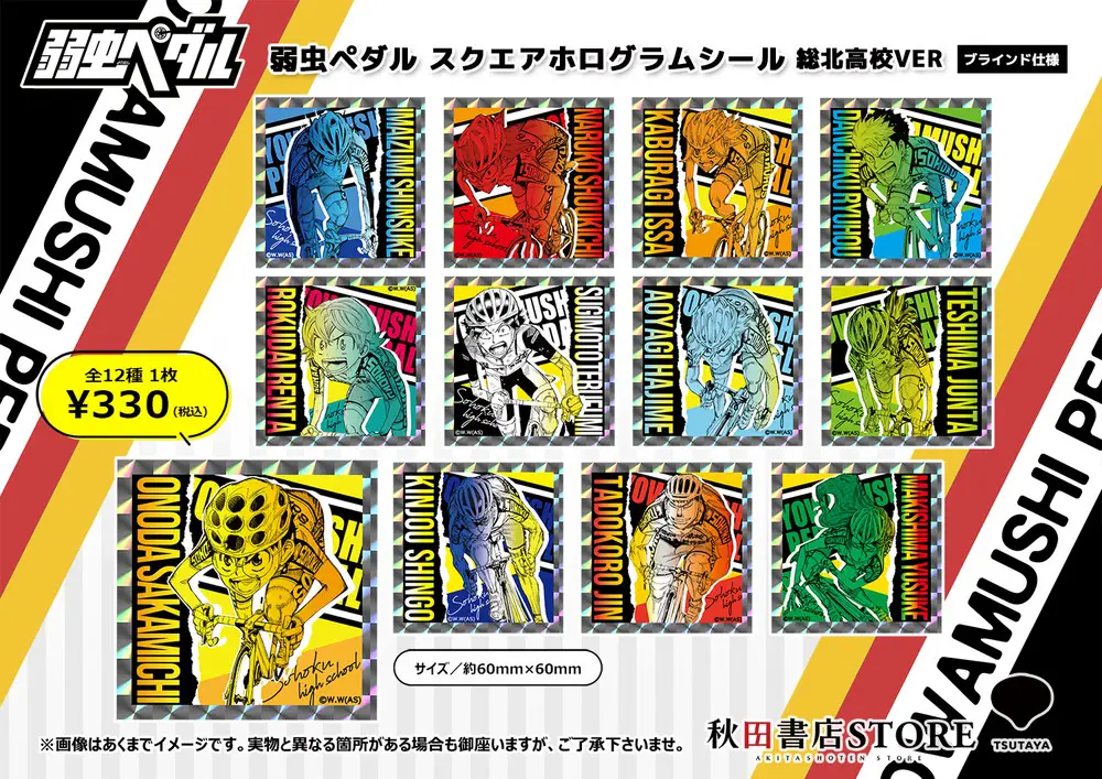 【弱ペダ】「弱虫ペダル スクエアホログラムシール」が発売中。総北高校VER 全12種・箱根学園VER 全11種。 ニュース X Bluesky Facebook LINE 2026.01.06 ニュース その他マンガ シールサイズは60mm×60mm。 【新商品情報】#弱虫ペダル12月30日(火)より下記店舗にて発売開始!SHIBUYA TSUTAYA IP書店6FTSUTAYA EBISUBASHI IP書店 B1F大阪西心斎橋アメリカ村店ノベルティもお見逃しなく! pic.twitter.com/kzUiG6Yenj— 秋田書店ストア (@akita_store) December 29, 2025