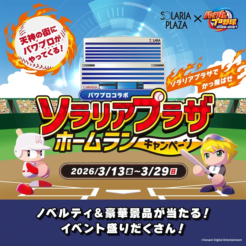 西日本鉄道株式会社が運営するソラリアプラザにて、2026年3月13日(金)~29日(日)の期間、KONAMIの人気野球ゲーム「パワフルプロ野球」とコラボレーション企画「ソラリアプラザ ホームランキャンペーン」が開催。