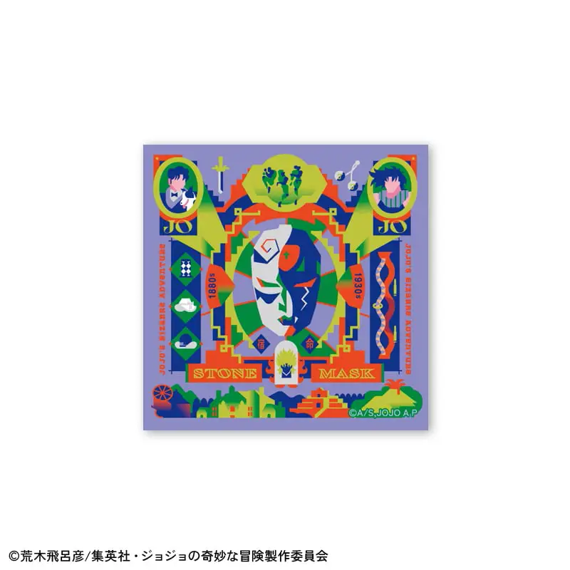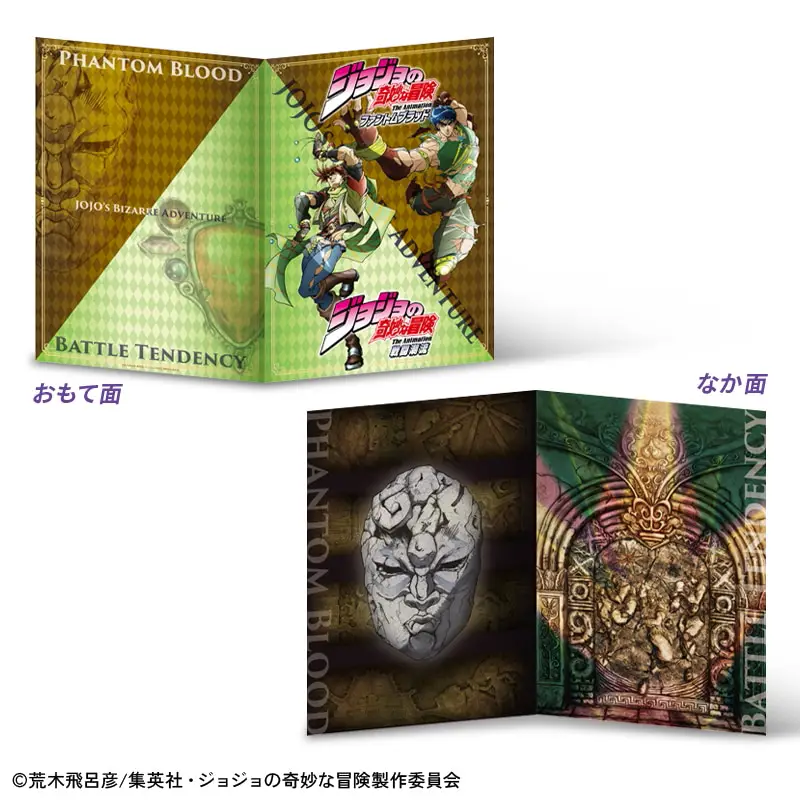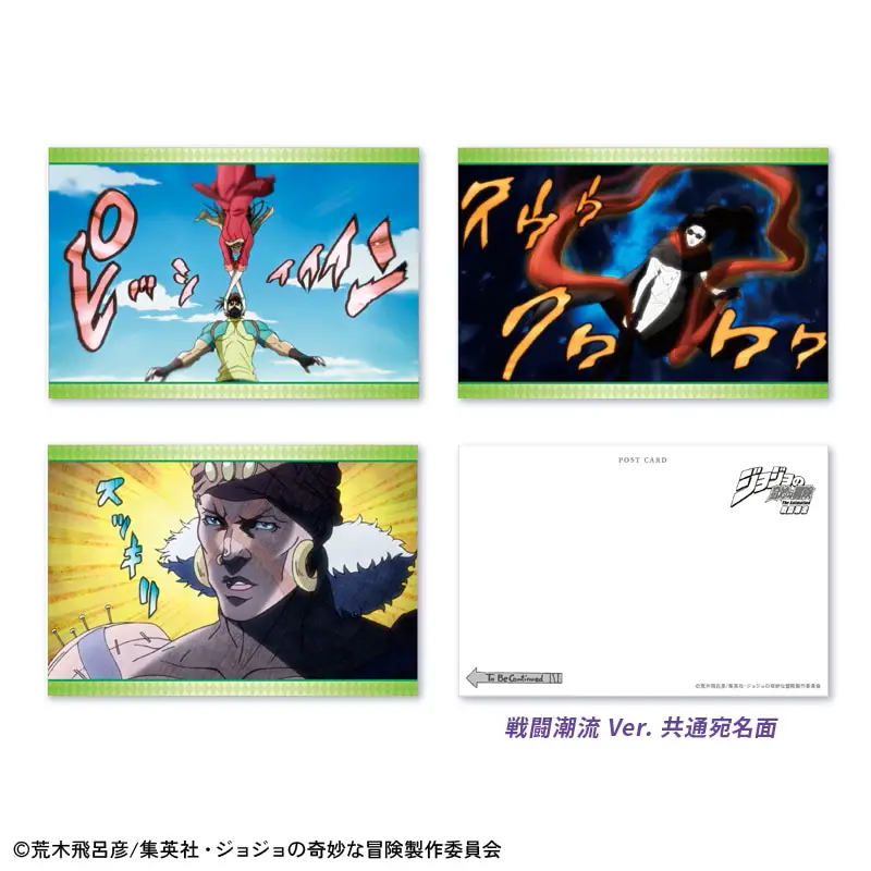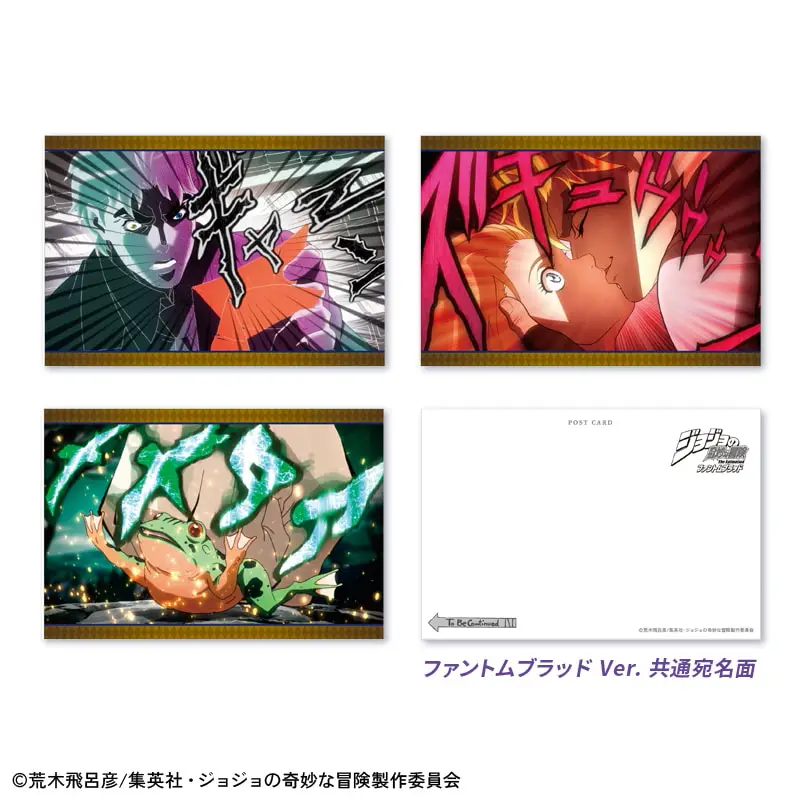 ジョナサン、ディオ、ジョセフ、シーザーなどが登場するフレーム切手に擬音シーンにフォーカスしたポストカード、オリジナルアートステッカーがついたセット商品です。