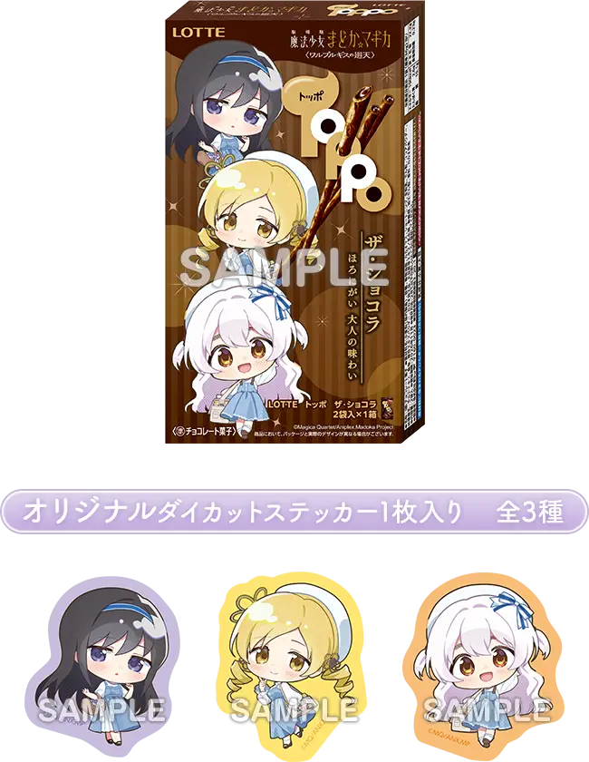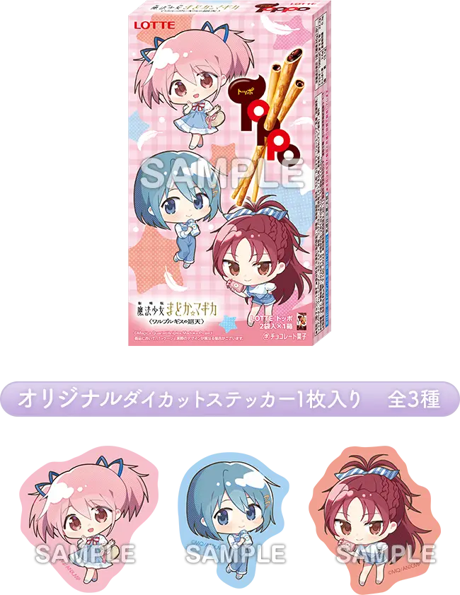 3/10(火)よりローソンにて開催される『劇場版 魔法少女まどか☆マギカ〈ワルプルギスの廻天〉』キャンペーンのコラボフードとして、オリジナルダイカットステッカー入り「トッポ」「トッポ ザ・ショコラ」が発売されます。ステッカーはそれぞれ2商品×3種で全6種。