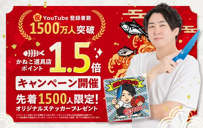 公式オンラインストア「かねこ道具店」にて対象商品を1,500円以上購入すると、先着1,500名に数量限定「1,500万人突破記念オリジナルステッカー」が進呈されます。