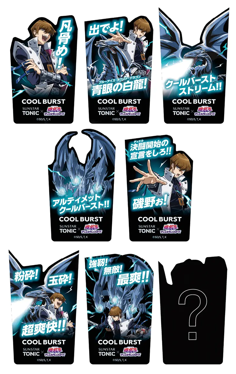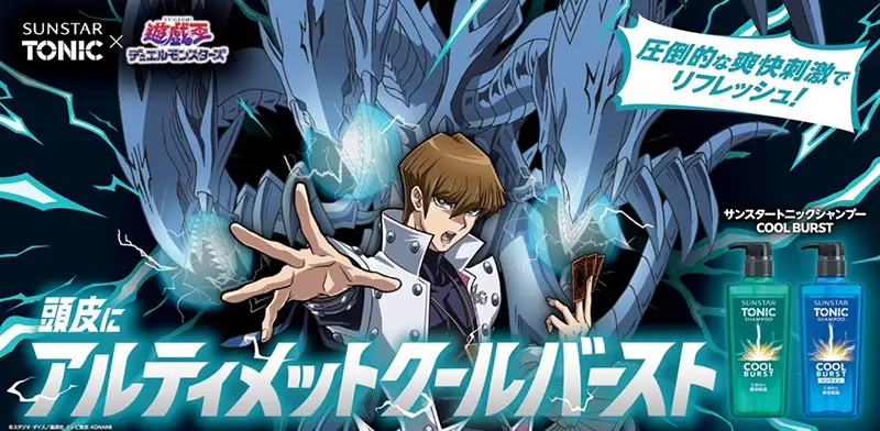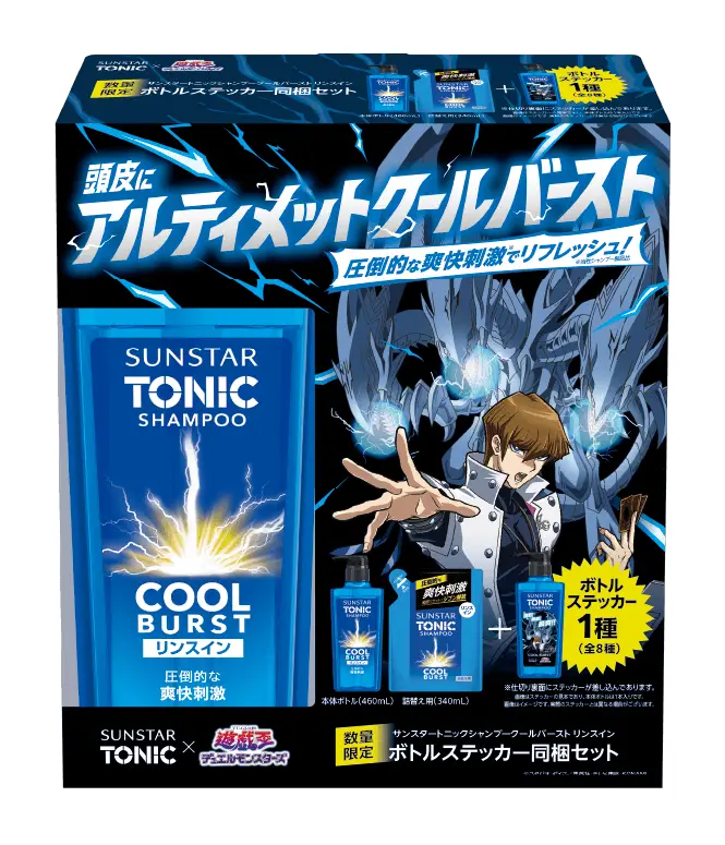 また、サンスタートニックシャンプーのボトルやスマホにも貼れる限定デザインステッカー1枚(全8種)を同梱した「サンスタートニックシャンプーCOOL BURST 遊☆戯☆王DM限定ステッカー同梱品」が全国のドラッグストア、ホームセンターなどで4/11(土)から順次発売予定。