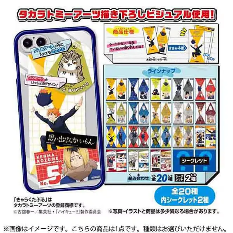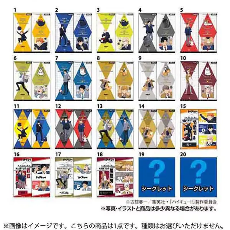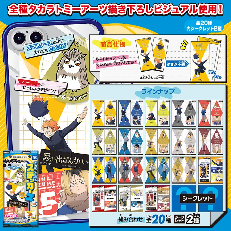 アニメ「ハイキュー!!」のきゃらくたぶるステッカーズ第6弾。タカラトミーアーツ描き下ろしビジュアル「playingマスコット」が使用されています。キャラクターたちの個性豊かな表情やポーズに注目です! シールは2枚ずつをセットにした全20種(40柄)の組み合わせで、そのうちシークレットが2種。チューインガム入り。