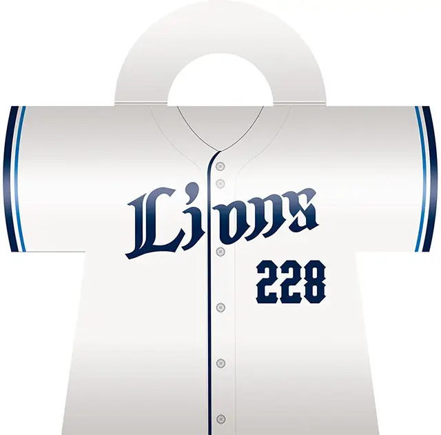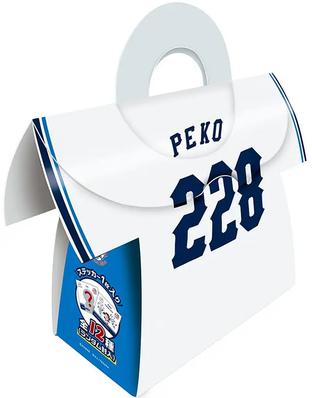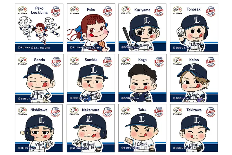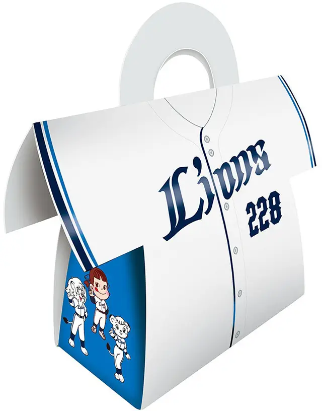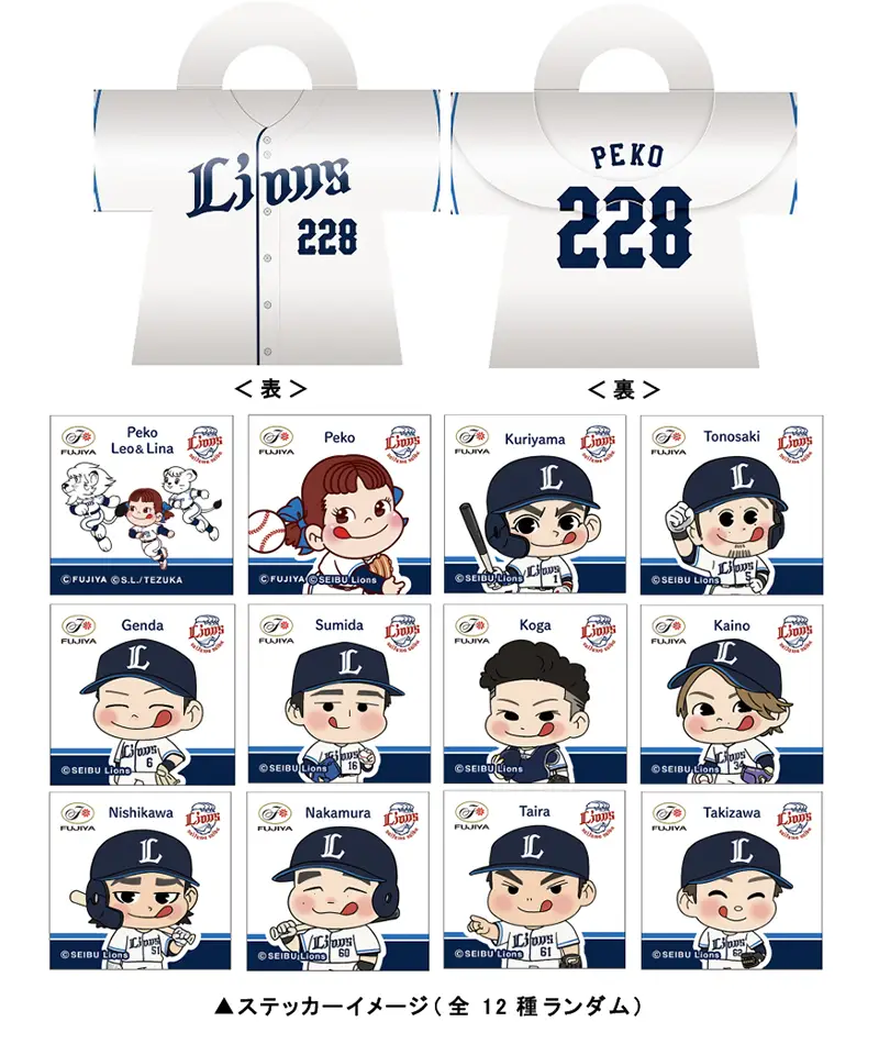 埼玉西武ライオンズのユニフォームデザインがギフトボックスに! 中には不二家のお菓子を詰め合わせました。ペコちゃん風に舌を出した埼玉西武ライオンズの選手たちが描かれたステッカー(全12種)がランダムで1枚封入されています。