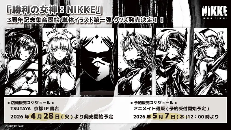 『勝利の女神:NIKKE』より、3周年で発表された11体からなる集合絵の墨絵グッズが大好評を博したことを受け、新たに単体イラスト“第一弾”のアイテムの発売が決定。