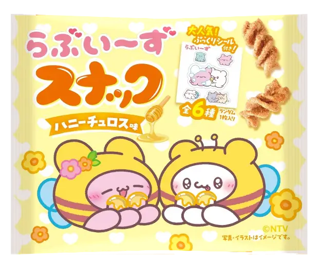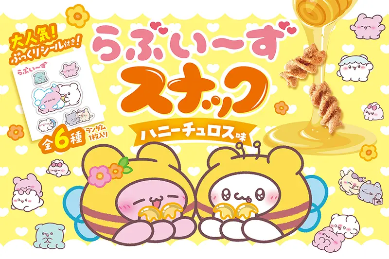 本商品に付属するぷっくりシールは「すもっぴ」や「ぴょんちー」を中心にデザインされた全6種類(うち1枚付属)。お菓子は「らぶいーず」の可愛らしい世界観に合わせ、ハニーチュロスをイメージして開発したオリジナル商品です。