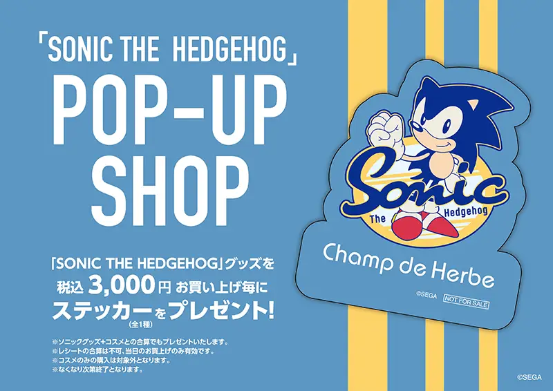 期間中、「SONIC THE HEDGEHOG」グッズを税込3,000円お買上毎に「オリジナルステッカー(全1種)」をプレゼントします。