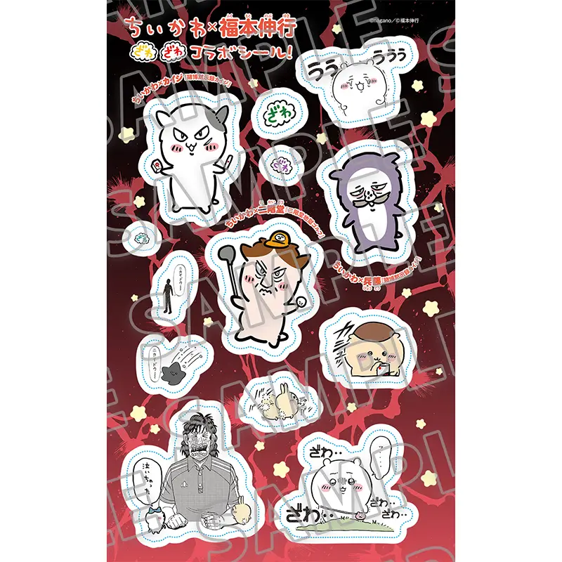 コラボシールには、福本伸行氏特別描き下ろしのちいかわ風二階堂進(『二階堂地獄ゴルフ』)をはじめ、ちいかわ風カイジや兵藤会長(ともに『賭博黙示録カイジ』)が登場。さらに、「ざわ‥ざわ‥」するちいかわや、「(二階堂が)泣いちゃった…」など、このコラボでしか見られない名場面(?)もシールになりました!