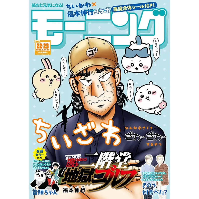 本日4月30日(木)発売の「モーニング」22・23合併号は、そんな『ちいかわ』と、『二階堂地獄ゴルフ』大好評連載中の福本伸行氏との前代未聞の“悪魔合体”による特別付録「ちいかわ╳福本伸行ざわ‥ざわ‥コラボシール」付き!