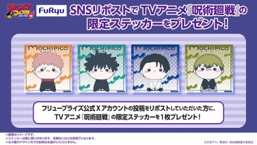 ジャンプフェスタ2026フリューブースで、公式Xの対象投稿をリポストすると「ハイキュー!!」or「呪術廻戦」のもちぴこデザイン限定ステッカーがもらえる。2025年12月20日(土)・21日(日)。